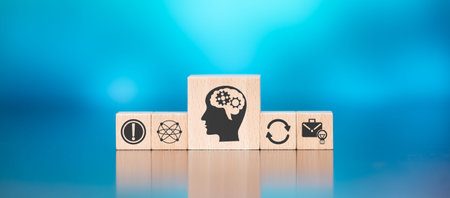 wooden cubes with the Leader Management Brain Idea icon. the concept of a leader's thinking