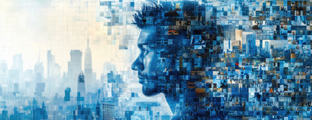 A man's silhouette stands against a backdrop of a bustling cityscape illuminated by twilight. The blend captures a sense of mystery and connection to the urban environment.