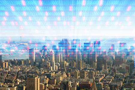 Abstract virtual coding illustration on New York cityscape background, software development concept. Multiexposure
