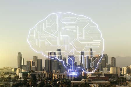Virtual creative artificial Intelligence hologram with human brain sketch on Los Angeles skyline background. Multiexposure