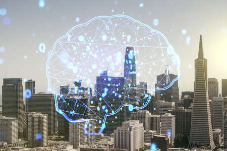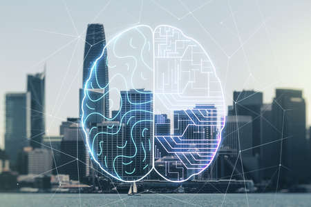 Double exposure of creative human brain microcircuit hologram on San Francisco office buildings background. Future technology and AI concept