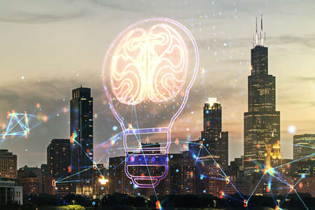 Abstract virtual light bulb illustration with human brain on Chicago cityscape background, future technology concept. Multiexposure