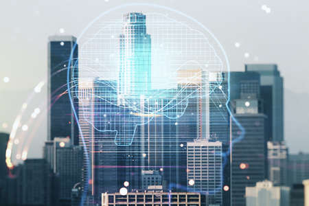 Abstract virtual artificial Intelligence interface with human head hologram on Los Angeles skyline background. Multiexposure