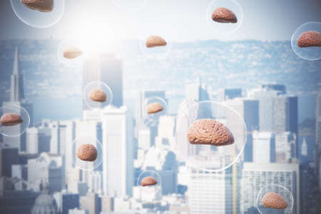 Abstract city background with brains in bubbles. Smart city, future and innovation concept. 3D Rendering