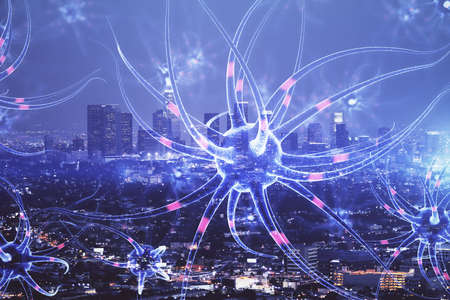Double exposure of neuron drawing icon and cityscape background. Concept of education.