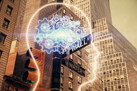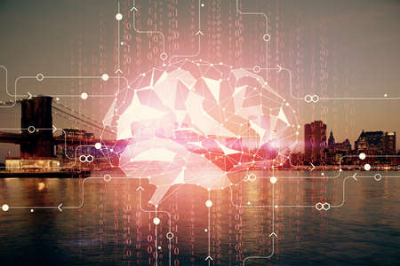 Double exposure of creative human brain microcircuit hologram on Manhattan office buildings background. Future technology and AI concept