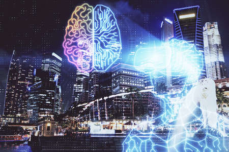Brain hologram drawing on city scape background Double exposure. Brainstorming concept.