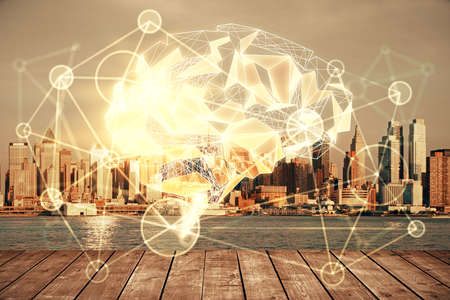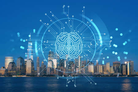 Skyline of New York City Financial Downtown Skyscrapers at night. Manhattan, NYC, USA. View from New Jersey. Artificial Intelligence concept, hologram. AI, machine learning, neural network, robotics