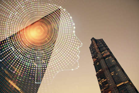Abstract virtual artificial Intelligence interface with human head hologram on office buildings background. Multiexposure
