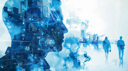 double exposure of woman head and skyscrapers smart technology in modern city communication technology