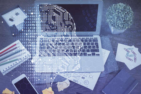 Multi exposure of brain sketch hologram over topview work table background with computer. Concept of big data.