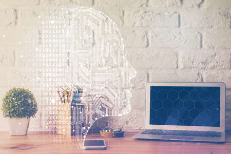 Creative artificial Intelligence concept with human head hologram on modern laptop background. Multiexposure