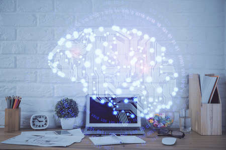 Double exposure of desktop with computer and brain drawing hologram. Artificial intelligence concept.