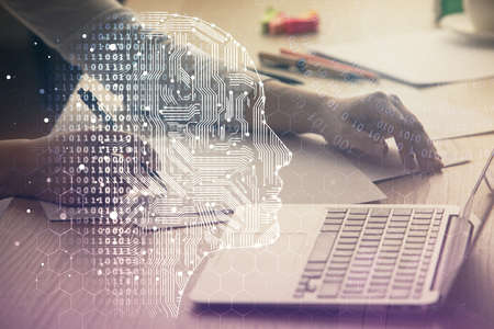 Double exposure of creative artificial Intelligence symbol with modern laptop on background. Neural networks and machine learning concept