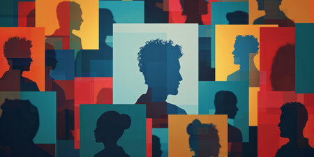 Brightly colored faces highlight diversity and the barriers created by bias, emphasizing individual differences and connections.