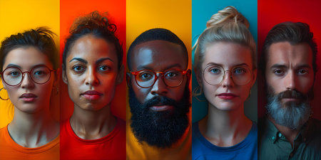 Diverse Group of Young Individuals Against a Vibrant Multicolored Background, Studio Portrait.