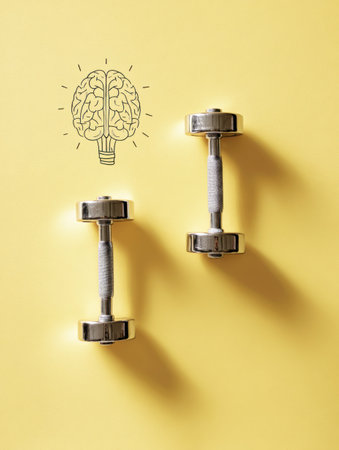Dumbbells on a bright yellow background symbolize mental training, blending physical strength with brain power in a vibrant design.