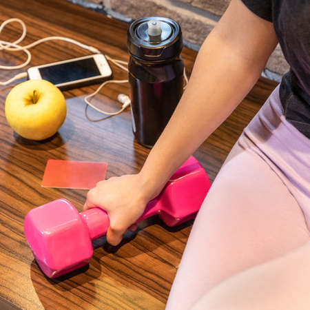 Woman holding pink dumbbell with smartphone headset apple water bottle