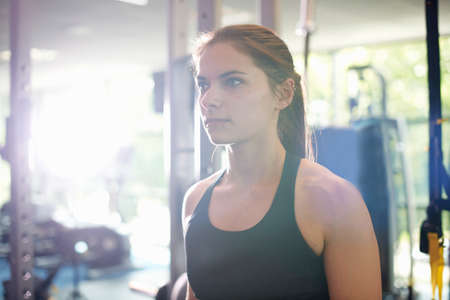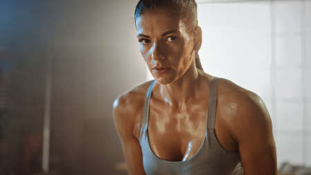 Close Up Portrait of a Beautiful Strong Fit Brunette Looking at the Camera in a Loft Industrial Gym with Motivational Posters. Shes Catching Her Breath after Intense Fitness Training Workout.