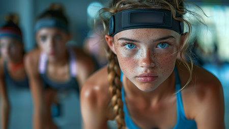 Leaning group of five focusing on AR financial charts in sports hall, wearing tank tops. Augmented, reality, dashboards, analytics, performance, training, teamwork