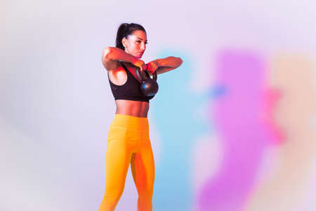 Fitness woman exercising holding kettle bell and weight on black background. Female model with muscular fit and slim body.