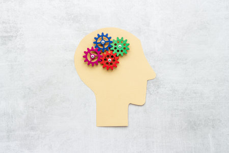 Creative human silhouette with colorful gears representing ideas and innovation, symbolizing the concept of cognitive processes and mental growth.