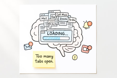 Drawing Of Overloaded Brain With Open Tabs, Notifications And Sticky Note With Quote Too Many Tabs Open , Concept Of Mental Overload, Digital Burnout, Modern Lifestyle And Productivity Challenges