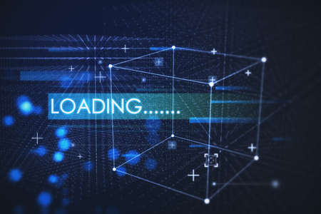 Creative blue loading background with cube hologram, polygonal dots and connections. Technology and innovation concept. 3D Rendering