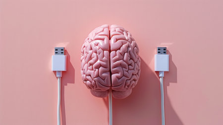 Top view of human brain model with USB cable, on pink background. Turn on your brain. Creative ideas. Generative AI.
