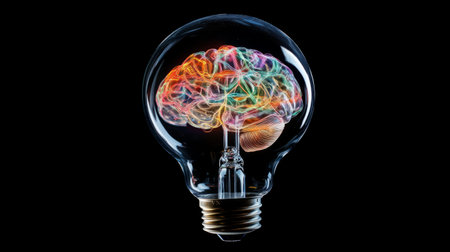 This conceptual image presents a human brain encased within a clear lightbulb. The composition features vibrant colors, with detailed textures suggesting a three-dimensional rendering. The artwork employs diffused lighting against a dark background, creating a sense of depth and focus. This visual could be utilized for educational materials or commercial presentations.