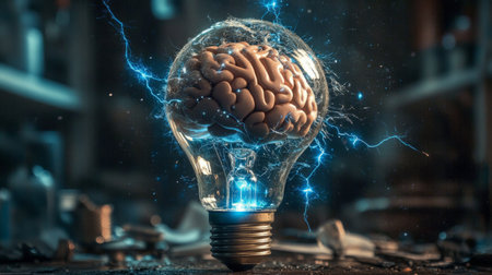 Human brain inside a broken light bulb, with blue electric sparks around it, innovation generative ai