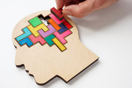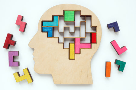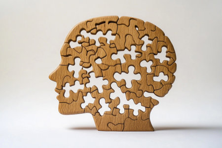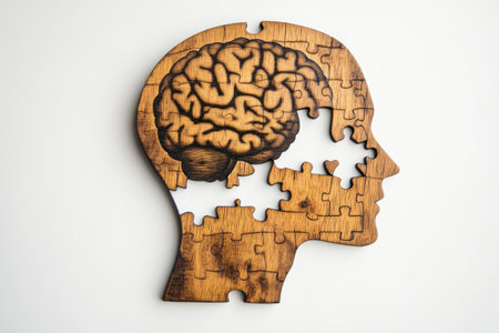 A wooden puzzle shaped like the side profile of an adult human head, with one half depicting iconic mental health symbols such as a brain and a smiley face. The background is white to highlight the intricate details in the wood grain and jigsaw pieces, symbolizing deep thinking or creative thought. --ar 3:2 --v 6.1 Job ID: d0282636-a389-4c30-8acf-c06f46c4ec65