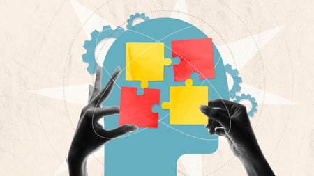 An illustration depicts a brain shape constructed with gears and surrounded by puzzle pieces. The image showcases a detailed artistic style with a mix of light and dark colors. The composition is set against a wooden background, suggesting an intellectual or mechanical concept. This image is suitable for educational or design projects.