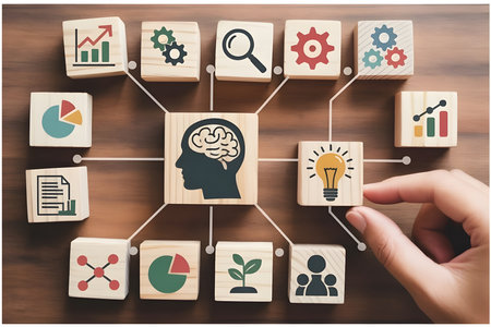 Conceptual Illustration of Interconnected Wooden Blocks with Innovation and Brain Icons
