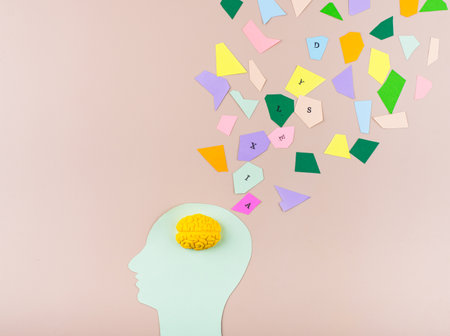 Mock up of a human brain with scattered puzzle pieces on a yellow and blue background. Six cubes in which you can write the word autism in your font.