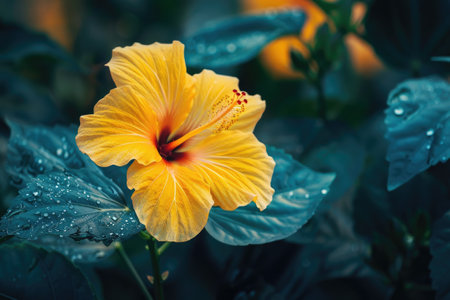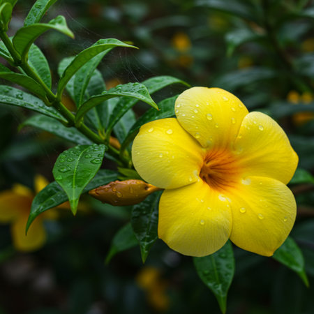 Allamanda cathartica, yellow flower with rain drops on leaves