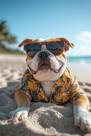 A bulldog lounging on a beach, wearing a Hawaiian shirt and sunglasses, with the ocean in the background