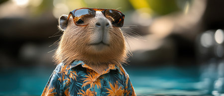 Capybara in sunglasses and Hawaiian shirt, cool beach vibe, teal background, quirky studio portrait