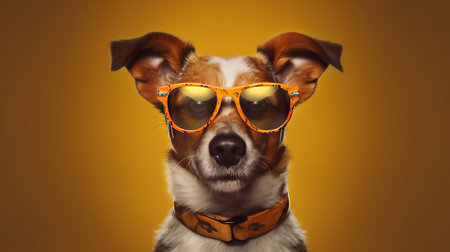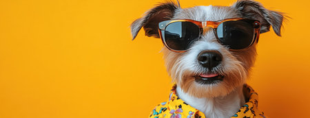 Dog in floral shirt and sunglasses, orange backdrop, closeup, cheerful and fun