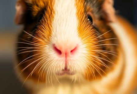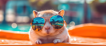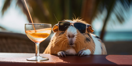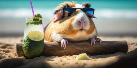 Guinea pig is on summer vacation at seaside resort and relaxing on summer beach