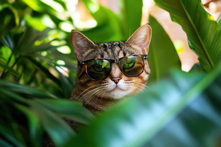Comedic portrait of a cat in sunglasses, basking in sunny vibes, perfect for humor, summer, or travel themes.