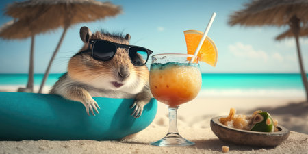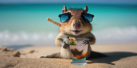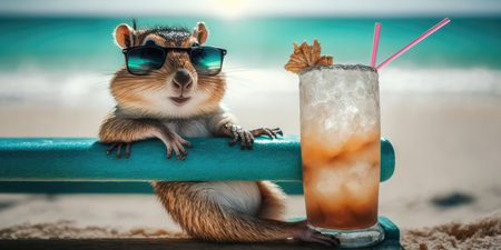 squirrel is on summer vacation at seaside resort and relaxing on summer beach