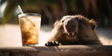 beaver is on summer vacation at seaside resort and relaxing on summer beach