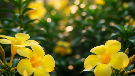143253 showing close-up of bright yellow allamanda flowers with green leaves and a soft bokeh background of sunlight...