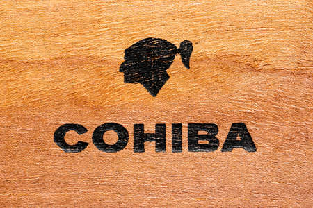 Cape Town, South Africa - January 28, 2022: Stamped brand logo of Cigar on cedar wood box