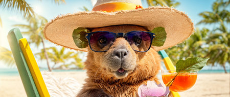 capybara in sunglasses and hat on the beach near the sea, looking at the camera. summer vacation by the sea