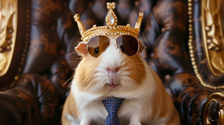 guinea pig wearing tie with crown and sunglasses sitting on a throne