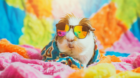 guinea pig sunglasses and scarf in studio with a colorful and bright background