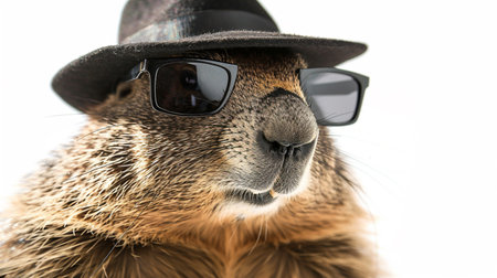 standing Groundhog uses black hat and black sunglasses isolated on white background