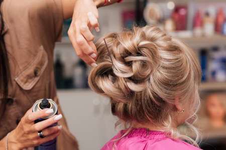 Close-up of hands of hairdresser making hairstyle unrecognizable young blonde woman in beauty salon, back view. Concept of beauty, fashion and stylish makeup.